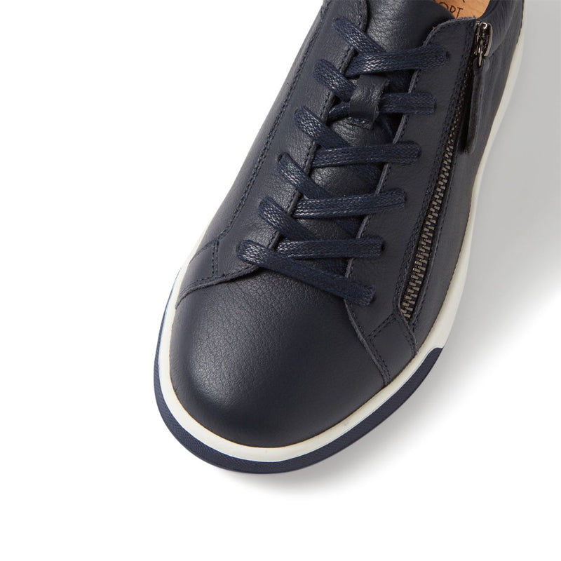 The AITO XF athleisure shoe provides the perfect combination of leisure and luxury with their sleek navy leather and lace design. The side zip adds a unique touch while ensuring a secure fit. The supportive and comfortable fit of these shoes is enhanced by the removable insole.