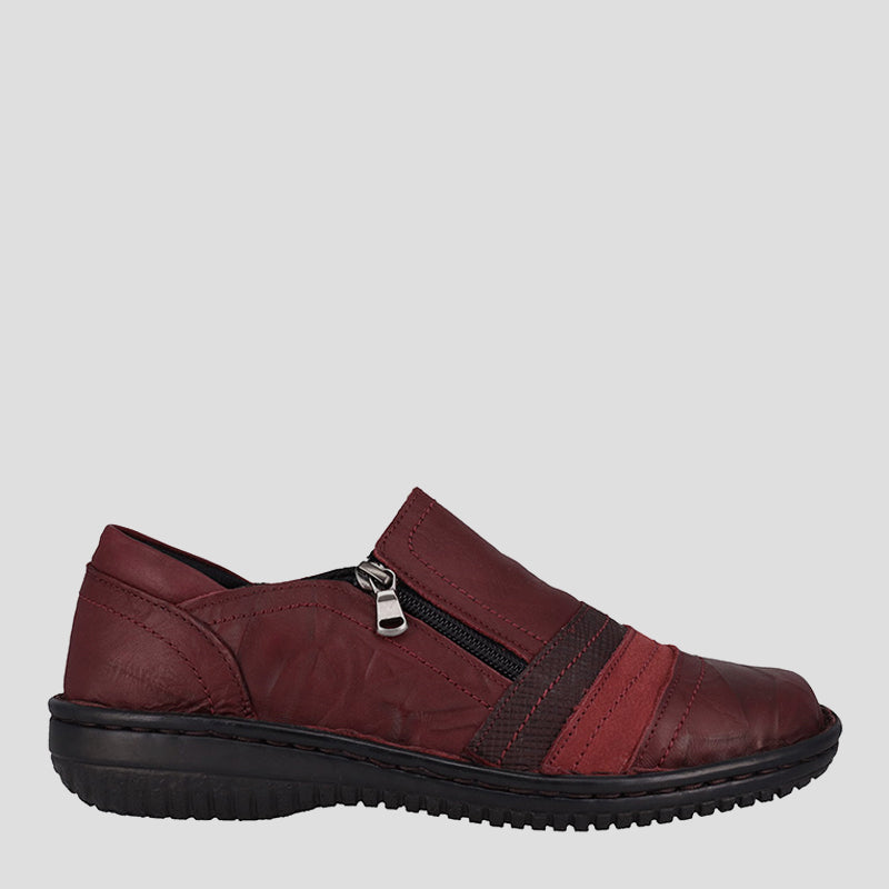- A zip on one side and elastic on the other side of the opening making it very easy to get in and out of the shoes while still having a secure fit.
