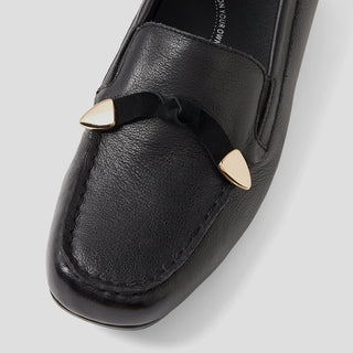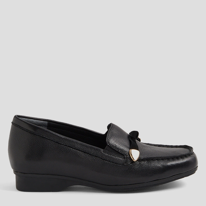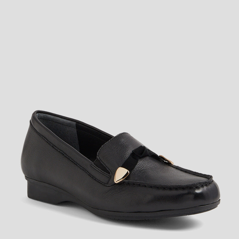 Indulge in luxury with FREMCH XF - BLACK. The flat, orthotic-friendly design is crafted with supple leather and accented with elegant gold detailing. Experience unmatched comfort and style in every step.