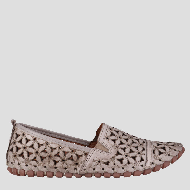 A comfortable and stylish slip-on shoe made from super soft leathers with decorative laser cut detail. Featuring a removable padded innersole to allow for orthotics, a flexible rubber sole and elastic gussets for a comfortable fit.